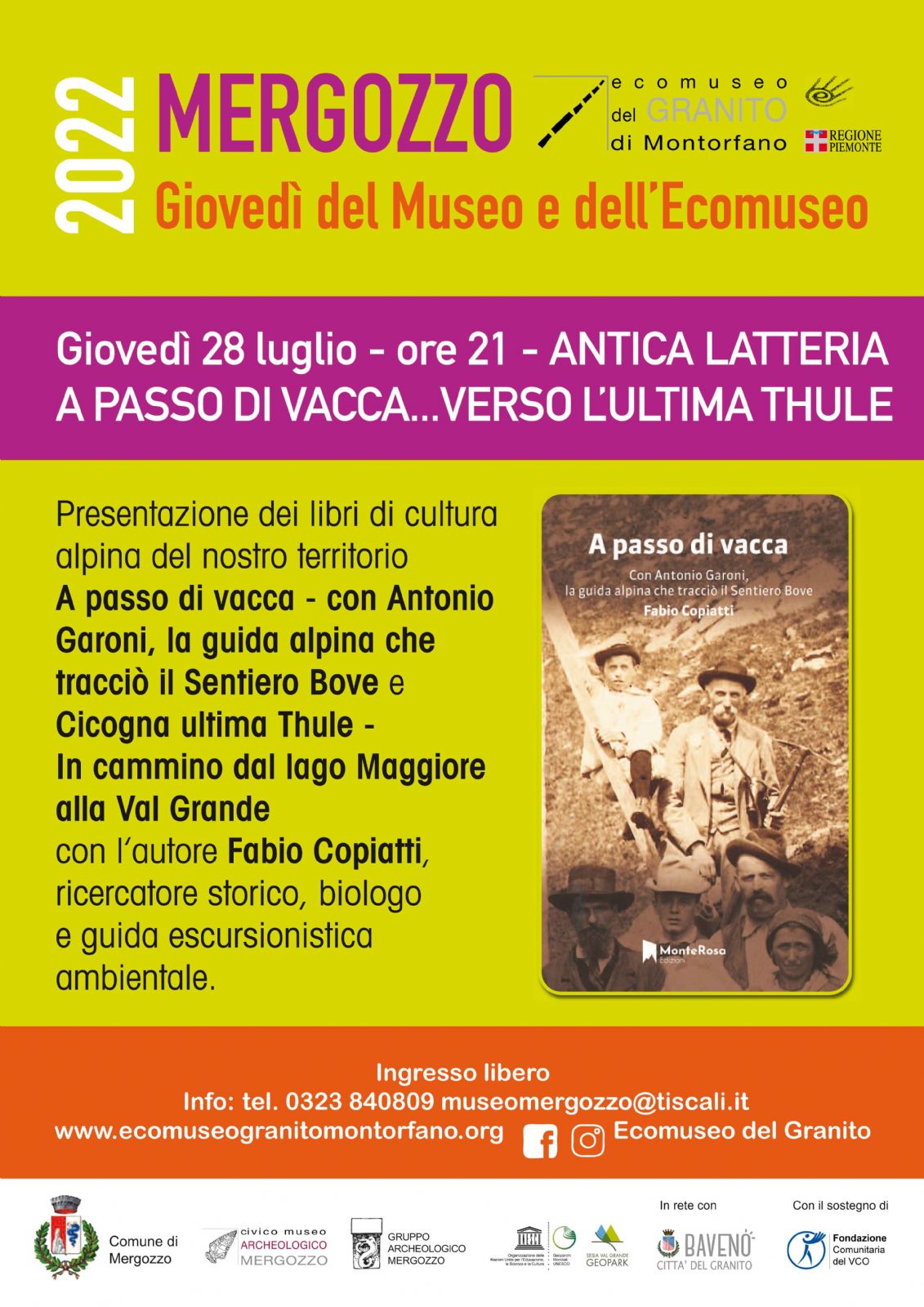Presentazione dei libri di cultura alpina del nostro territorio A passo di vacca e Cicogna ultima Thule con l’autore Fabio Copiatti, ricercatore storico, biologo e guida escursionistica ambientale.