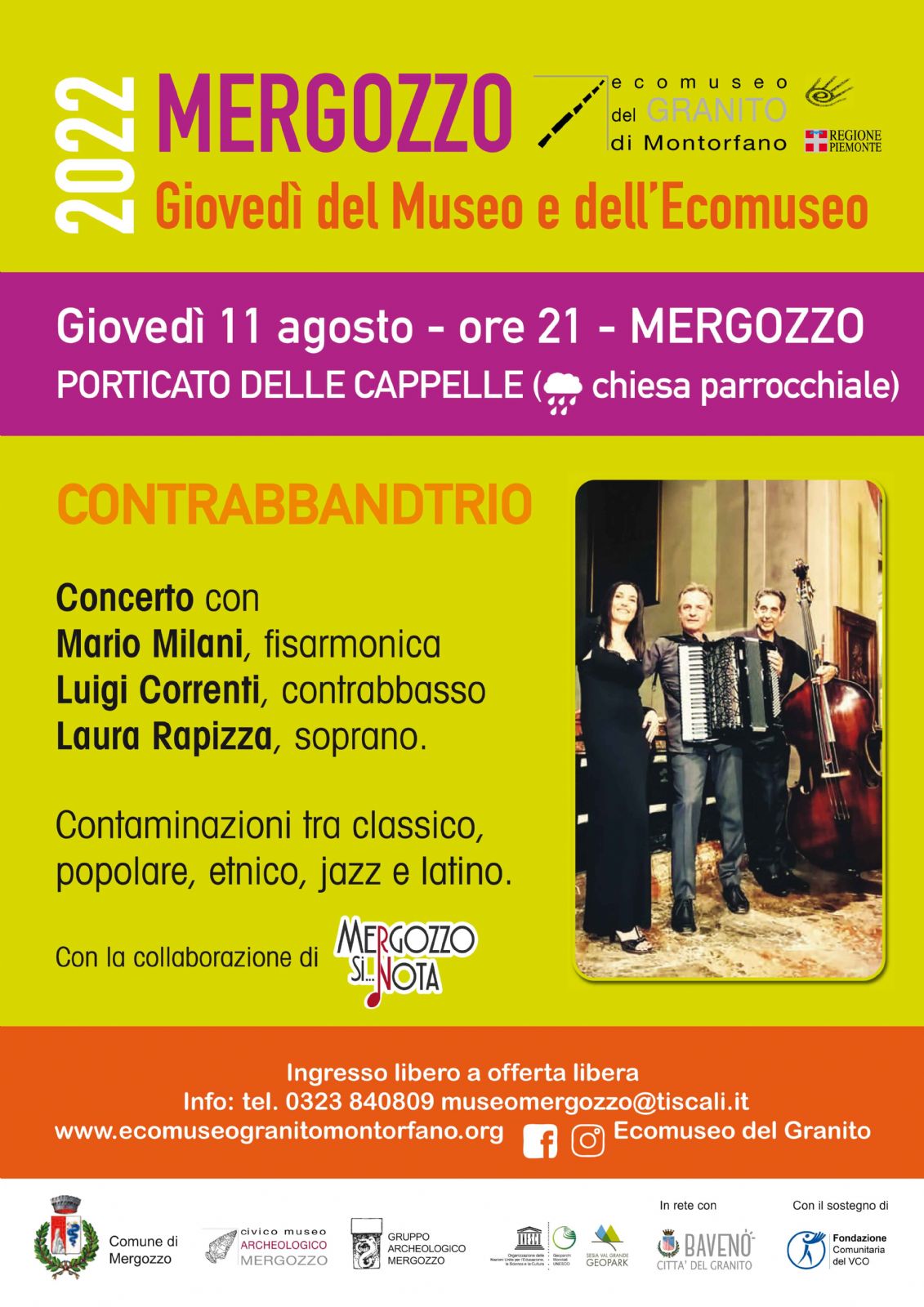 Per la stagione culturale “La pietra racconta 2022”, che gode del sostegno della Fondazione Comunitaria VCO, nell’ambito dei “Giovedì del Museo e dell’Ecomuseo” arriva una originale proposta musicale, promossa dal Museo con la collaborazione di “Mergozzo si nota”: Giovedì 11 agosto alle ore 21, presso il Porticato delle Cappelle (in caso di cattivo tempo nella chiesa parrocchiale di Mergozzo) si terrà il concerto “Contaminazioni” con il ContrabbandTRIO formato da Mario Milani, fisarmonica – Luigi Correnti, contrabbasso – Laura Rapizza, soprano, che propone inedite contaminazioni tra classico, popolare, etnico, jazz e latino, il tutto con la splendida voce della soprano Rapizza.