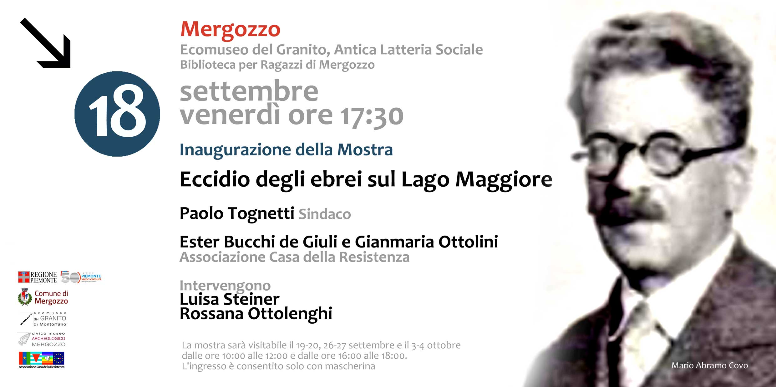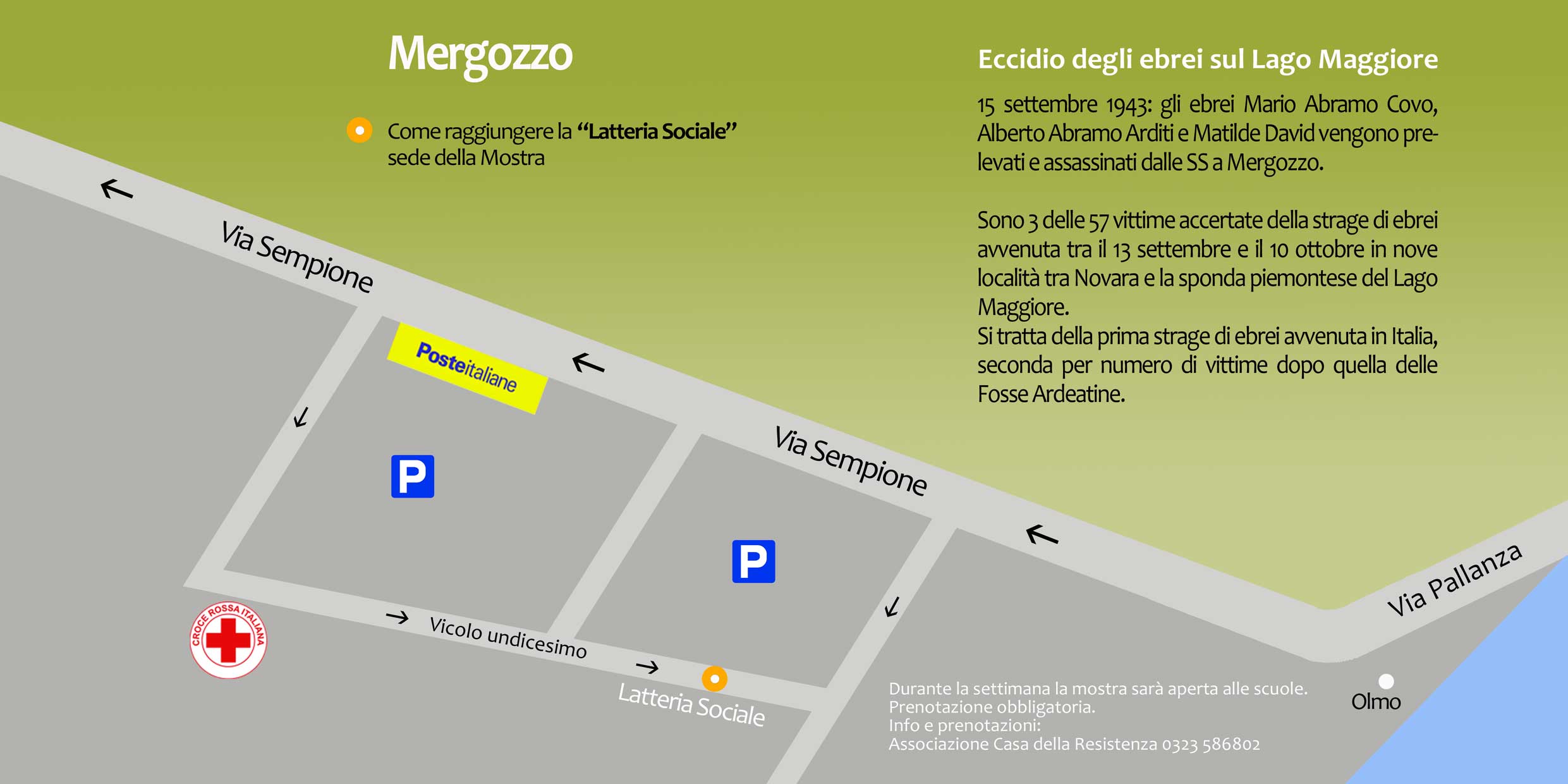 "Il Comune di Mergozzo in collaborazione con l'Associazione Casa Della Resistenza, l'ANPI Fondotoce-Mergozzo, la Biblioteca per Ragazzi di Mergozzo, Il Museo Civico Archeologico e l'EcoMuseo del Granito di Montorfano organizza presso l'Antica Latteria Sociale una mostra sull' Eccidio degli Ebrei sul Lago Maggiore.