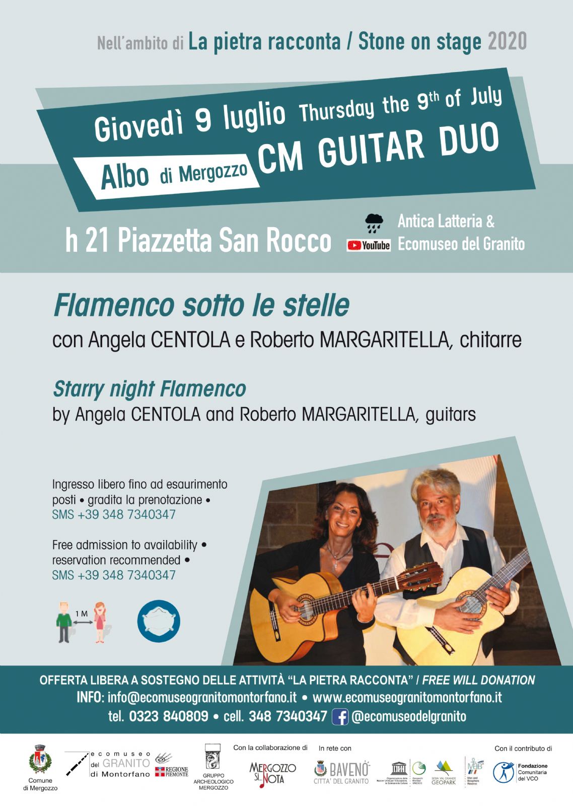 Il primo appuntamento sarà giovedì 9 luglio alle ore 21 nella suggestiva e raccolta cornice di piazzetta San Rocco nella frazione di Albo di Mergozzo. Qui il Duo di chitarre composto da Angela CENTOLA e Roberto MARGARITELLA proporrà Flamenco sotto le stelle, mescolando in un programma di sicuro fascino brani di grandi classici del genere (Mario Escudero, Ernesto Lequona, Paco Pena, Sabicas) con brani composti dalla stessa Angela Centola, affermata compositrice per chitarra flamenca e prima donna in Italia ad aver ottenuto il diploma magistrale in Chitarra Flamenca.