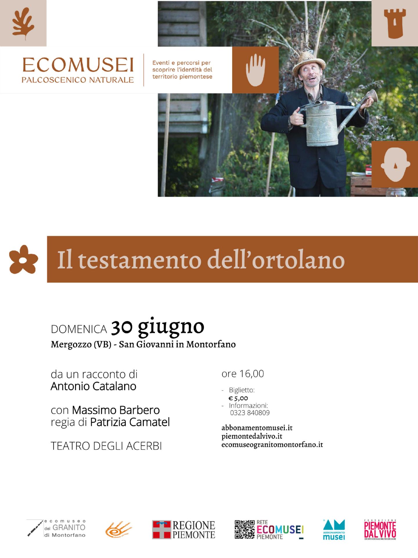 Lo spettacolo “Il testamento dell’ortolano” è una narrazione fiabesca sull’armonioso rapporto dell’uomo con la natura da un racconto di Antonio Catalano, con Massimo Barbero - regia di Patrizia Camatel - In collaborazione con Piemonte dal Vivo per la rassegna “Ecomusei palcoscenico naturale”