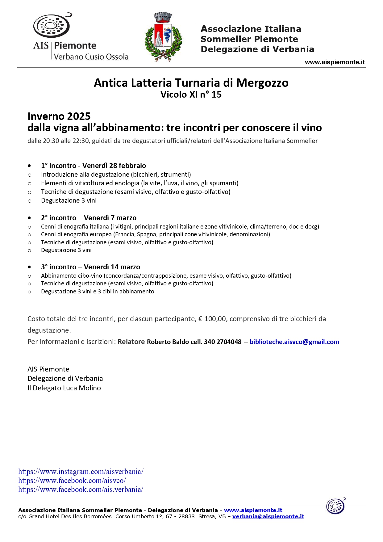 L'Associazione Italia Sommelier Piemonte Delegazione di Verbania in collaborazione con Il Comune di Mergozzo organizza tre incontri formativi per conoscere i vari aspetti legati alla conoscenza e all' abbinamento dei vini.