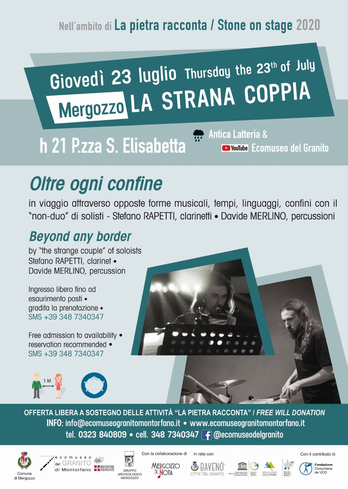 L’appuntamento di giovedì 23 luglio alle ore 21 è cuore di pietra di Mergozzo, la piazzetta S. Elisabetta nel rione del Sasso. Qui LA STRANA COPPIA, un “non-duo” composto da due solisti, Stefano RAPETTI, clarinetto, e Davide MERLINO, percussioni, propone un viaggio fatto di contrasti, contrasti tra forme di espressione musicale antiche e contemporanee, attraverso secoli e linguaggi diversi, abbattendo ogni confine in un amalgama insolito e originale.