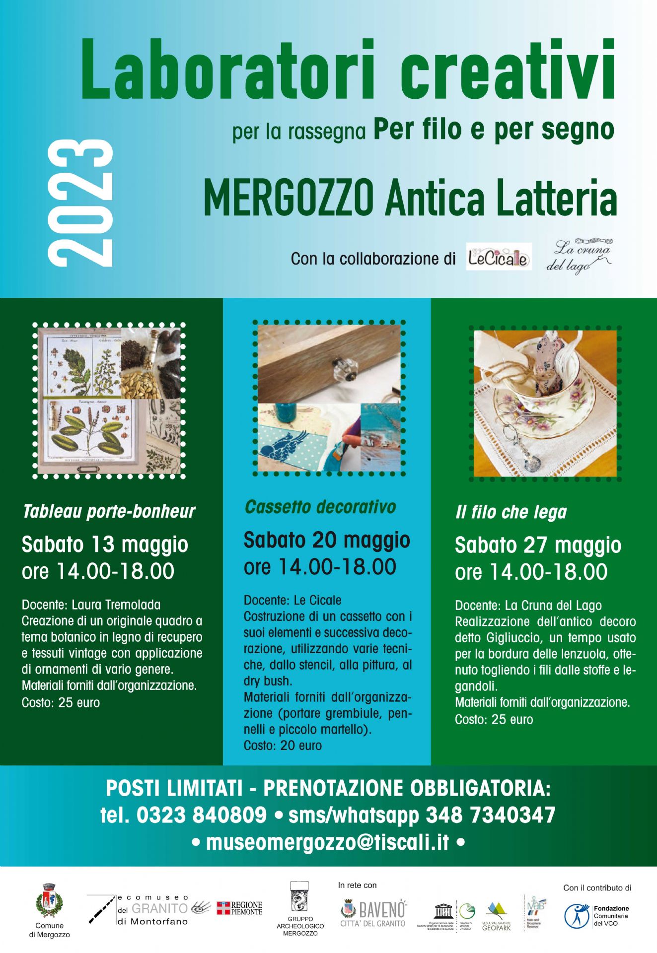 Nell’Antica Latteria di Mergozzo (Vicolo XI, n. 11) anche quest’anno vengono proposti workshop che puntano a stimolare fantasia e manualità. L’iniziativa è promossa dall’Ecomuseo del Granito e dal Comune di Mergozzo, con la collaborazione dei gruppi Le Cicale e La Cruna del Lago e con il sostegno di Fondazione Comunitaria VCO, nell’ambito del progetto “La pietra racconta”.