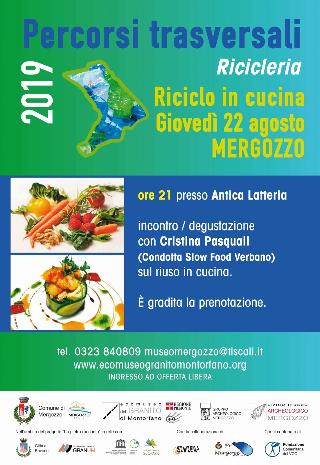 Un nuovo intrattenimento culturale collegato alla mostra d’arte diffusa “Percorsi trasversali” – Ricicleria allestita a Mergozzo, è in programma giovedì 22 agosto alle ore 21 presso l’Antica Latteria di vicolo XI, 11a. Si tratta di una serata dedicata al “Riciclo in cucina”, tenuta da Cristina Pasquali della Condotta Slow food Verbano. L’incontro sarà l’occasione per scoprire tante nuove idee per recuperare gli avanzi di cibo e limitare così gli sprechi alimentari. Durante la serata potranno essere assaggiate alcune delle ricette proposte nella lezione.
