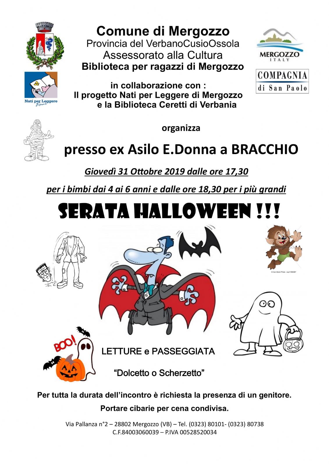 Il Comune di Mergozzo in collaborazione con la Biblioteca per ragazzi di Mergozzo, il Gruppo nati per leggere di Mergozzo e la Biblioteca Ceretti di Verbania organizza Giovedì 31 Ottobre 2019 presso ex-asilo E.Donna a Bracchio dalle ore 17,30 "Serata Halloween" letture del gruppo Nati Per Leggere di Mergozzo e passeggiata "Dolcetto Scherzetto