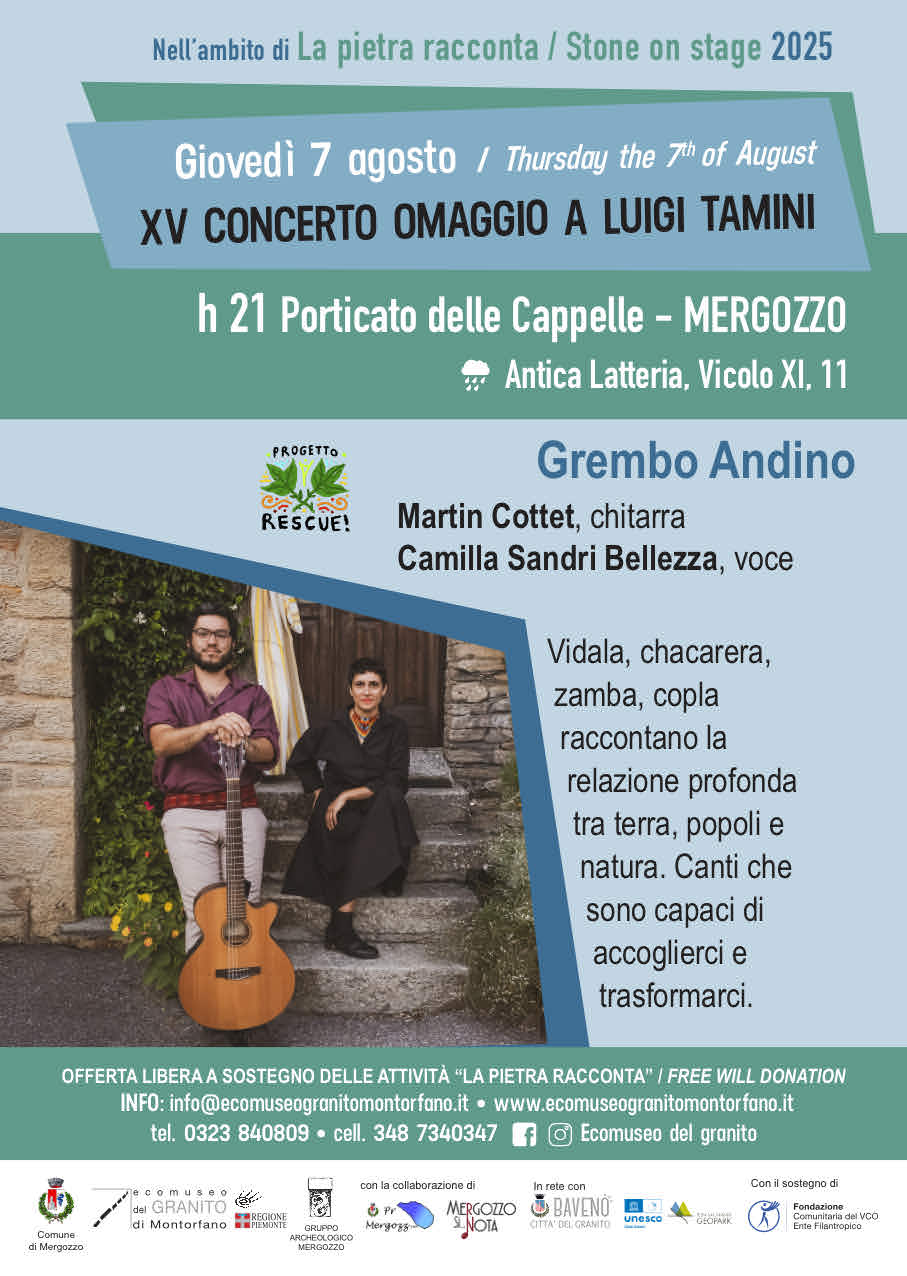 Come amata consuetudine fin dal 2005 il Civico Museo Archeologico di Mergozzo presenta annualmente un concerto in onore del mecenate Luigi Tamini, medico, che con la fortuna accumulata in Argentina a fine Ottocento, beneficò il paese natale donando, tra le altre cose, il Palazzo che oggi ospita il museo.