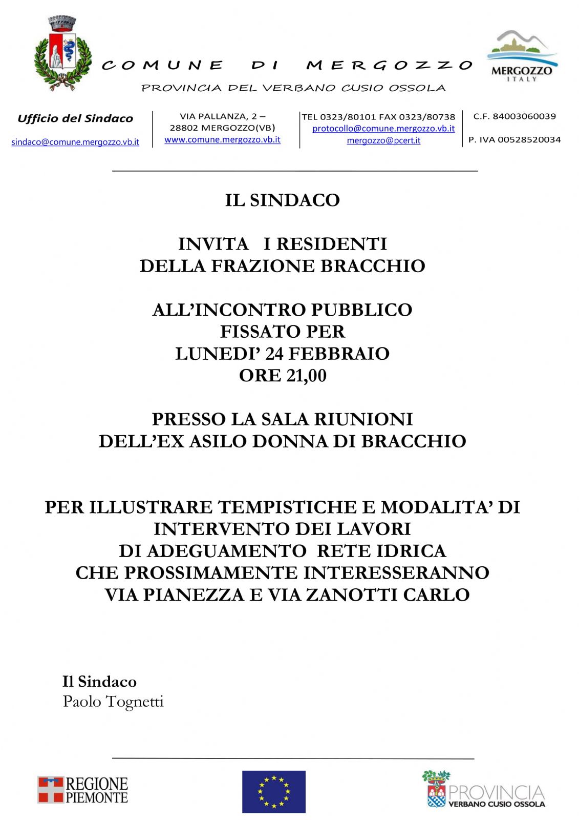 AVVISO INVITO A RIUNIONE PUBBLICA RESIDENTI FRAZIONE BRACCHIO PER ILLUSTRARE TEMPISTICHE E MODALITA' LAVORI SU RETE IDRICA