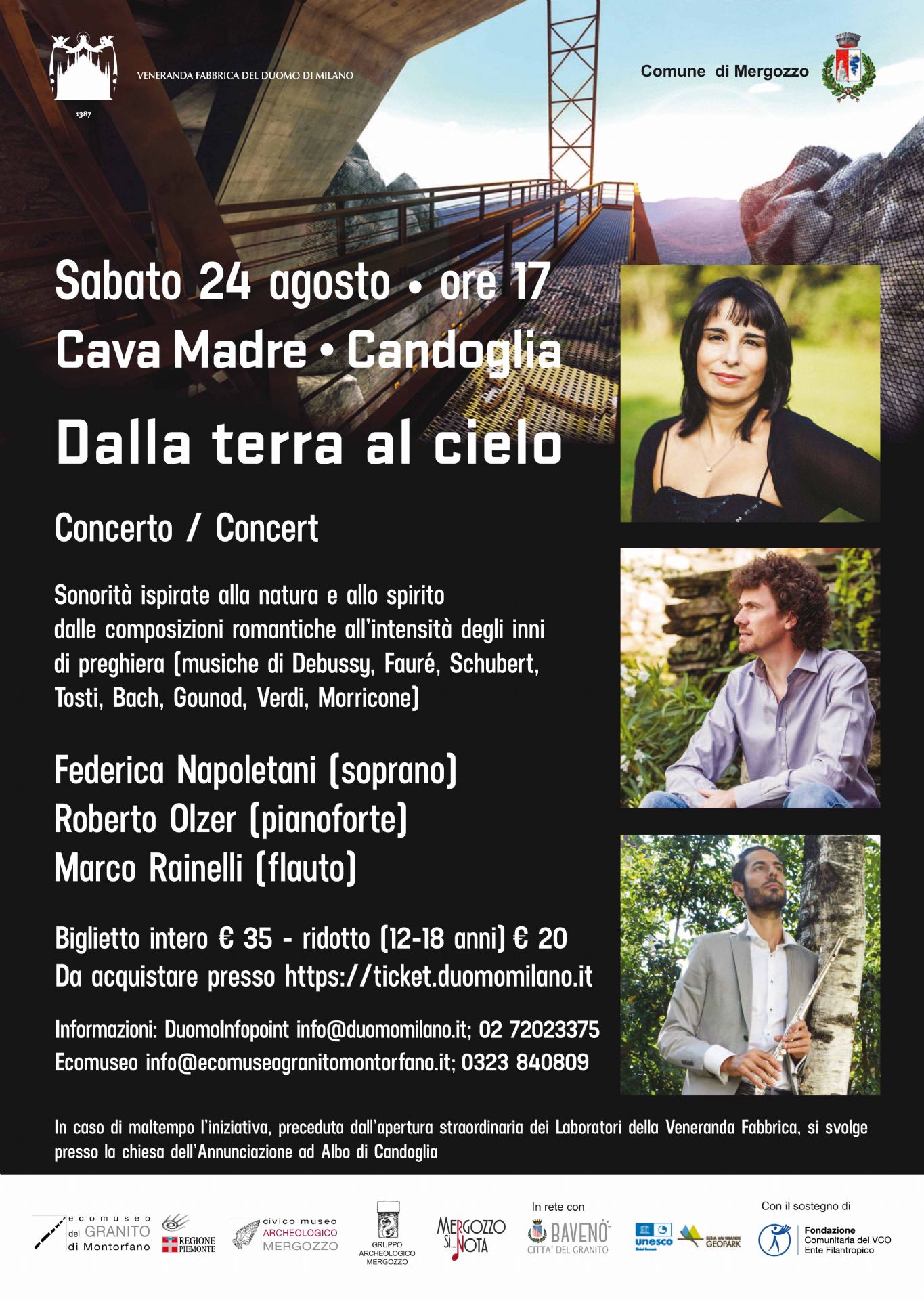 Nell’ambito della collaborazione per la valorizzazione del territorio ossolano e delle sue risorse lapidee attivata tra Ecomuseo del Granito di Montorfano, Comune di Mergozzo e Veneranda Fabbrica del Duomo di Milano, sabato 24 agosto alle ore 17.00 presso la Cava Madre a Candoglia (Comune di Mergozzo – Provincia del Verbano-Cusio-Ossola) verrà proposto il concerto: “Dalla terra al cielo”, un percorso sonoro che esprime il legame profondo che unisce l’uomo, la natura e l’infinito, dalle composizioni romantiche all’intensità degli inni di preghiera, con le musiche di Debussy, Fauré, Schubert, Tosti, Bach, Gounod, Verdi, Puccini, Morricone..