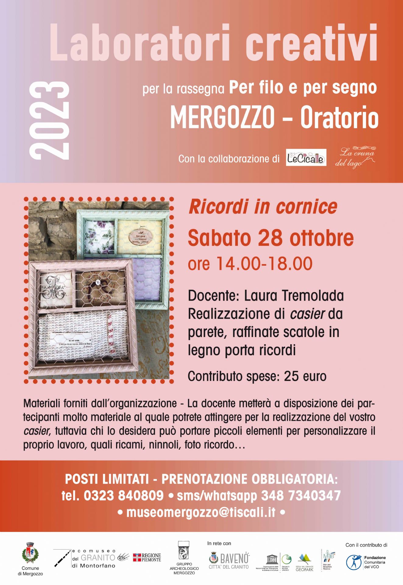 Laura Tremolada metterà a disposizione dei partecipanti molto materiale al quale potrete attingere per la realizzazione del vs casier, tuttavia chi lo desidera può portare piccoli elementi per personalizzare il proprio lavoro, quali ricami, ninnoli, foto ricordo…