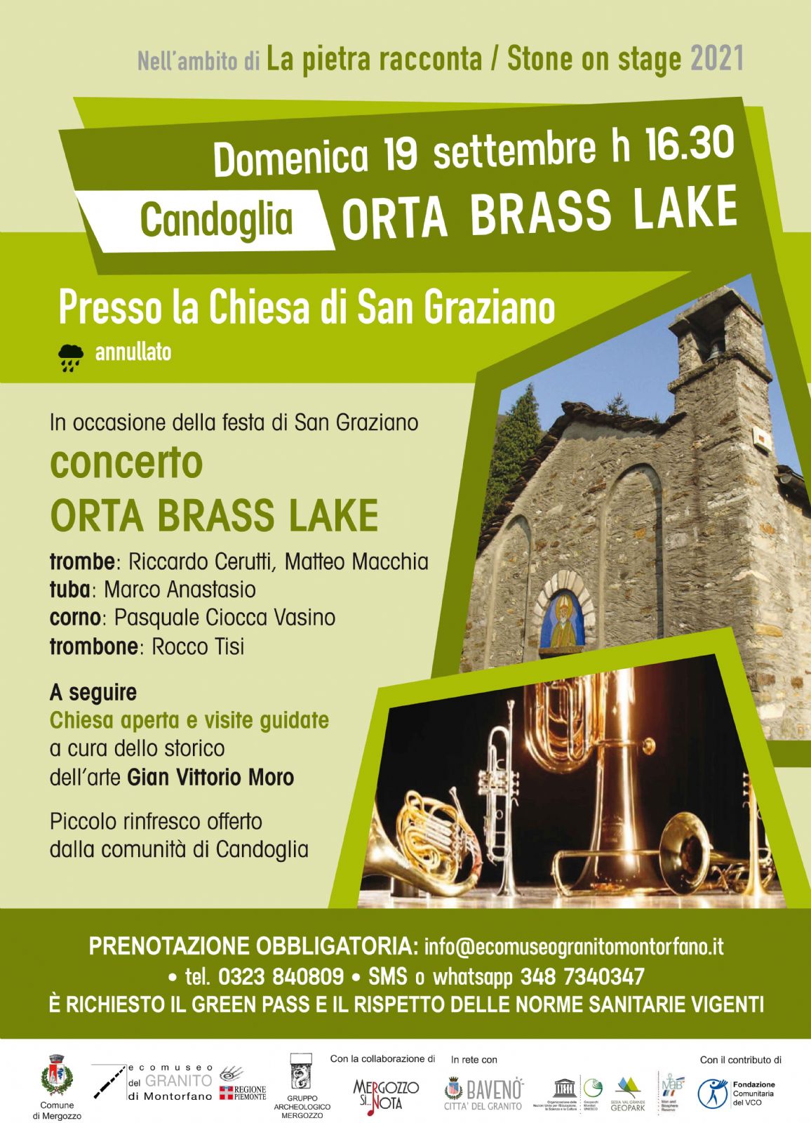 Nell’ambito della rassegna “La pietra racconta”, organizzata dai Comuni di Baveno e Mergozzo e dall’associazione GAM, con il sostegno di Fondazione Comunitaria del VCO, salutiamo l’estate domenica 19 settembre ore 16.30 con un concerto di ORTA BRASS LAKE, eclettico quintetto di ottoni, nell’area a prato presso la chiesa romanica di San Graziano a Candoglia (in caso di cattivo tempo nella chiesa), in concomitanza con la ricorrenza del Santo cui è intitolata.