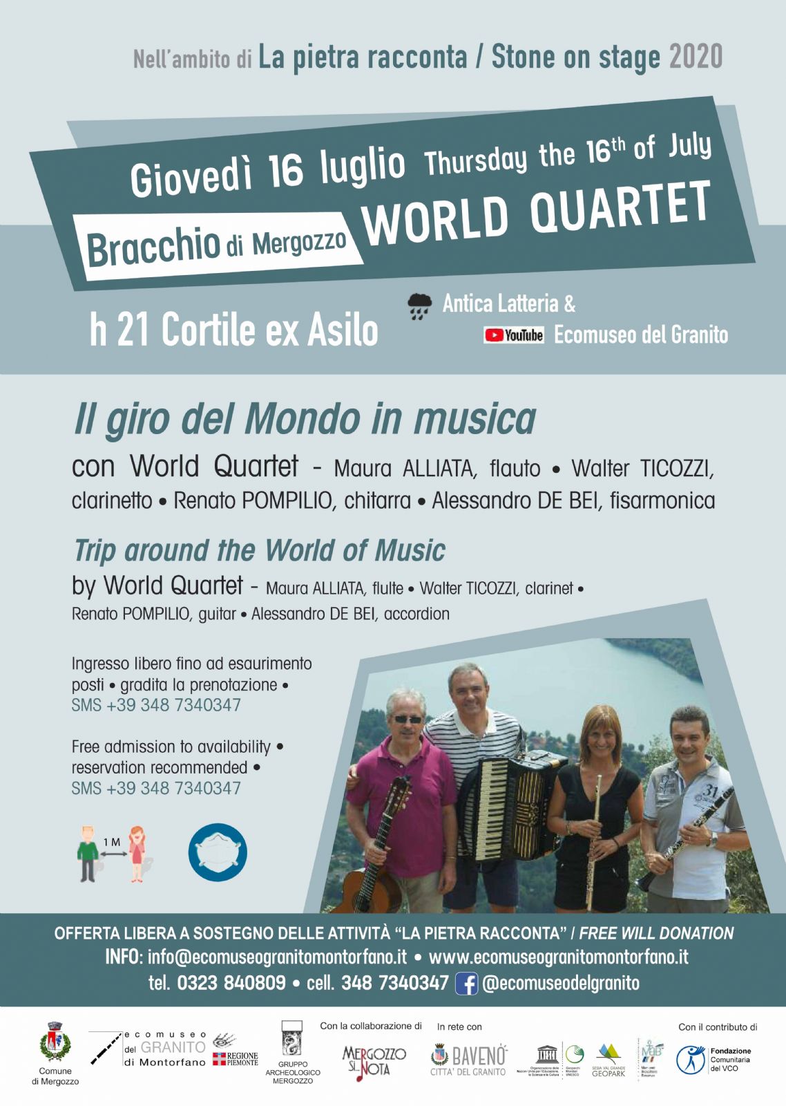 Al pubblico è richiesto di indossare la mascherina. In caso di cattivo tempo il concerto verrà proposto all’interno dell’Antica Latteria per un numero limitato di persone, dando priorità all’ordine di arrivo delle prenotazioni, e affiancando la trasmissione in diretta sul canale You Tube Ecomuseo del Granito.
