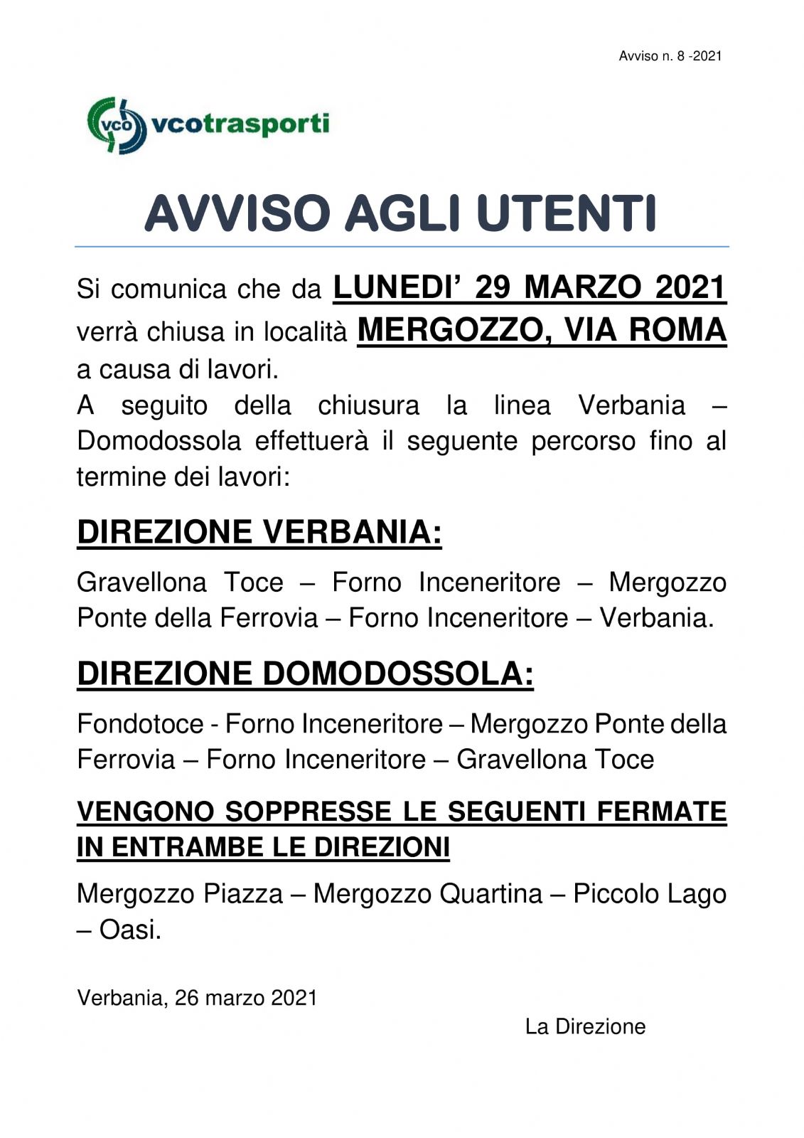 A seguito ordinanza di chiusura di Via Roma in Mergozzo, per i lavori di posa del nuovo acquedotto, si trasmette in allegato l'avviso di VCO Trasporti relativo alle modifiche della linea Verbania - Domodossola.