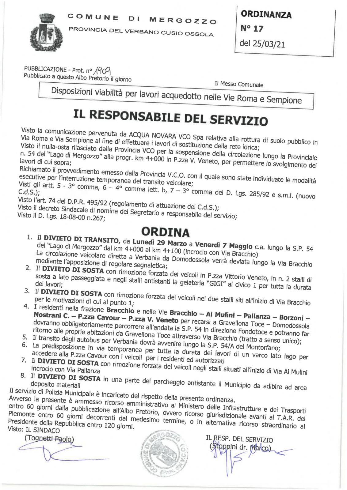 La via Bracchio rimarrà normalmente percorribile al traffico di chi arriva da Domodossola ed è diretto a Verbania.