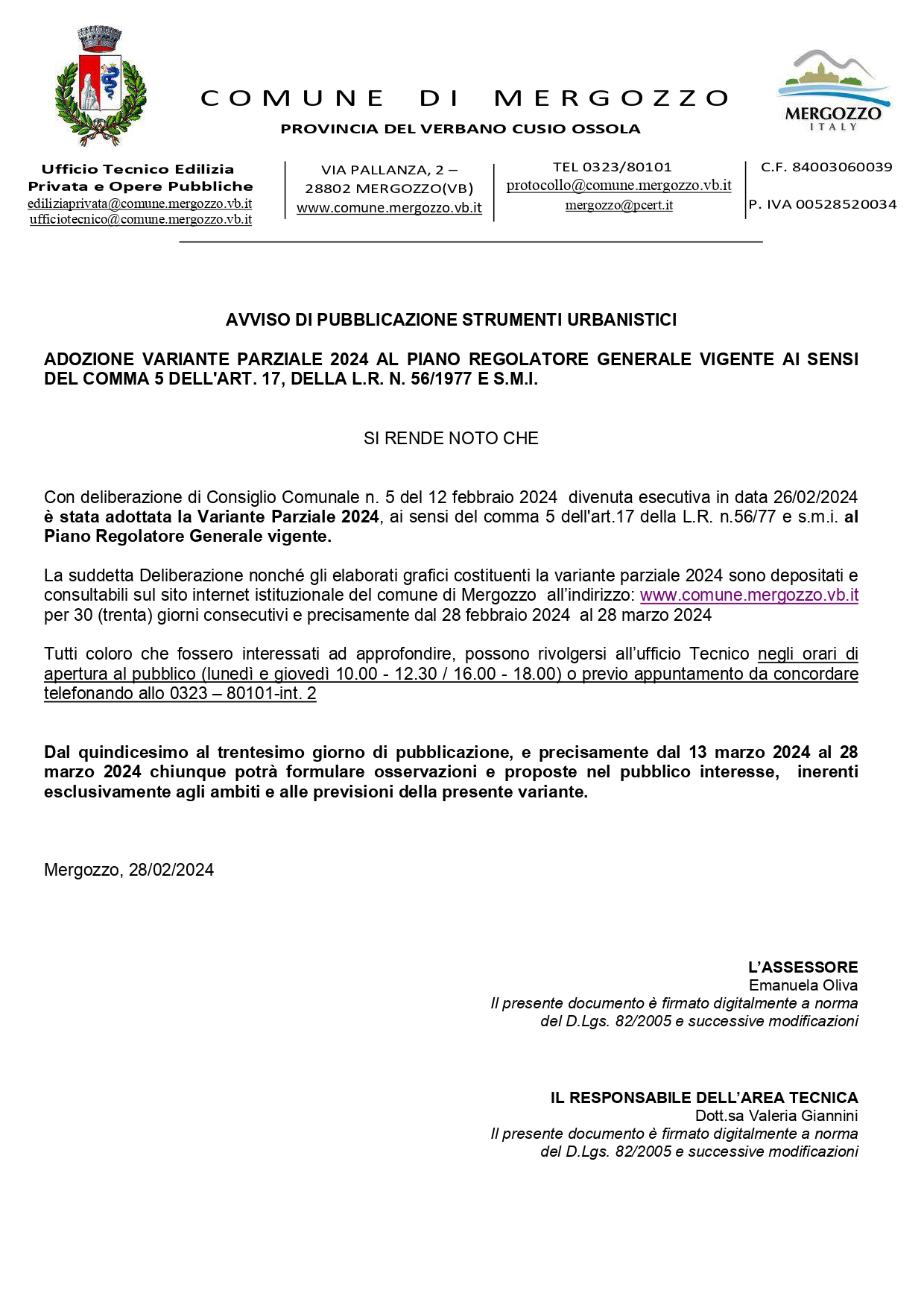 La suddetta Deliberazione nonché gli elaborati grafici costituenti la variante parziale 2024 sono depositati e consultabili sul sito internet istituzionale del comune di Mergozzo all’indirizzo: www.comune.mergozzo.vb.it per 30 (trenta) giorni consecutivi e precisamente dal 29 febbraio 2024 al 29 marzo 2024