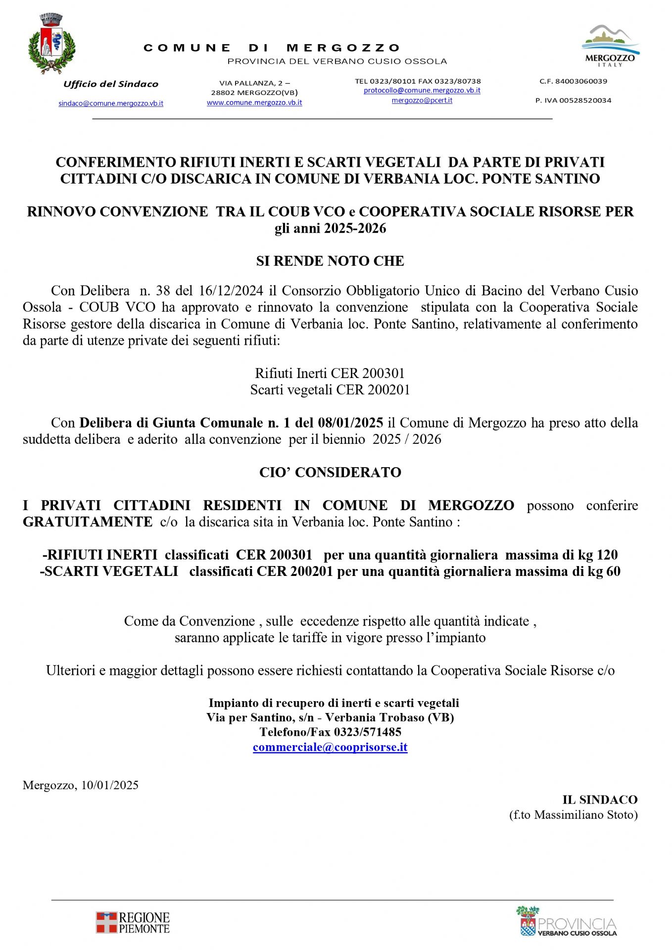 Con Delibera di Giunta Comunale n. 1 del 08/01/2025 il Comune di Mergozzo ha rinnovato anche per il il 2025 e 2026 la convenzione con Coub Vco e la Cooperativa Sociale Risorse relativa al conferimento gratuito da parte dei cittadini residenti nel Comune di Mergozzo di alcune tipologie di rifiuto presso la discarica in loc. Ponte Santino nel Comune di Verbania .