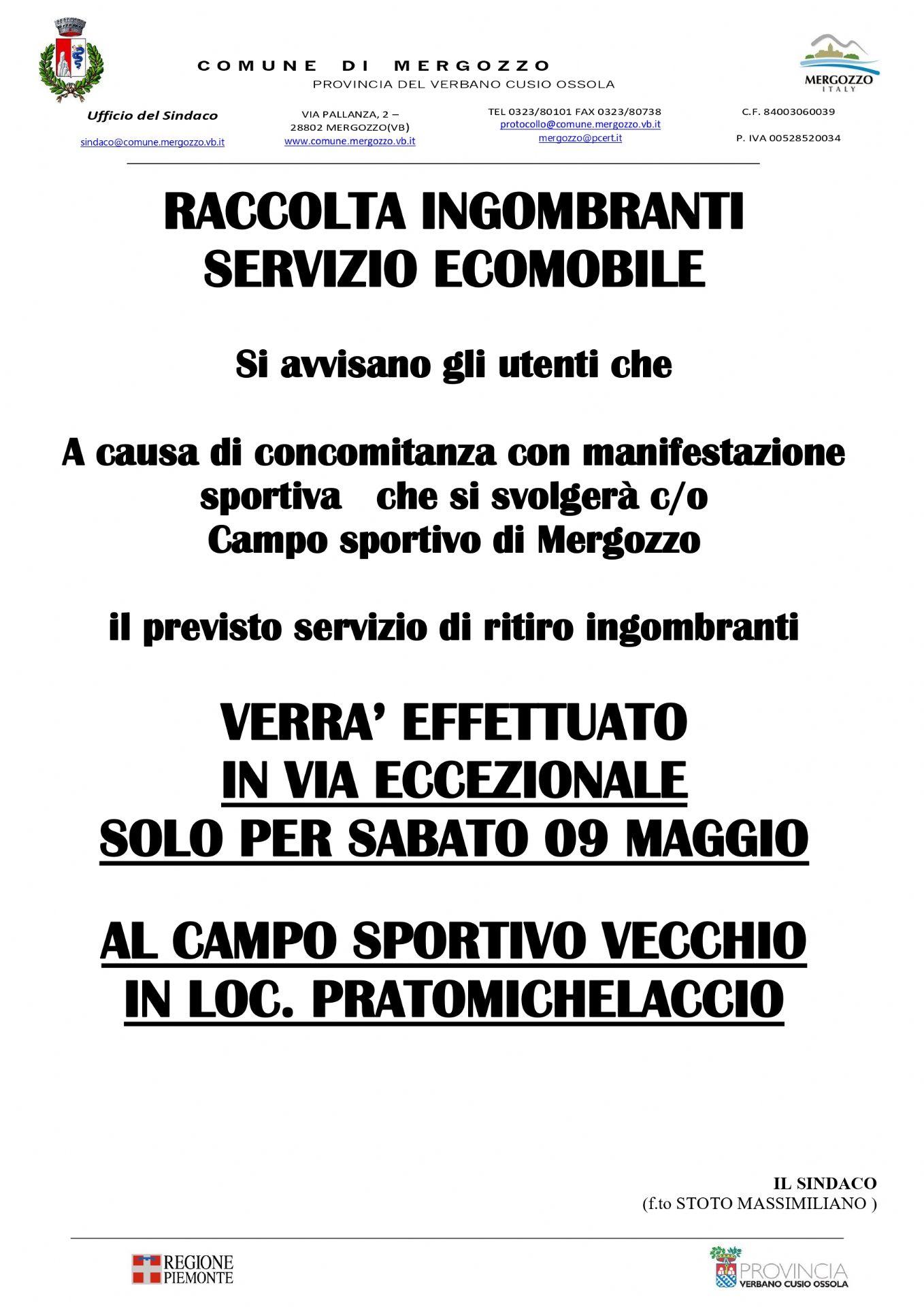 Si avvisa che , causa concomitanza con manifestazione sportiva, la raccolta ingombranti con ecomobile prevista per SABATO 9 MAGGIO si svolgerà presso Campo Sportivo Vecchio in loc. Pratomichelaccio