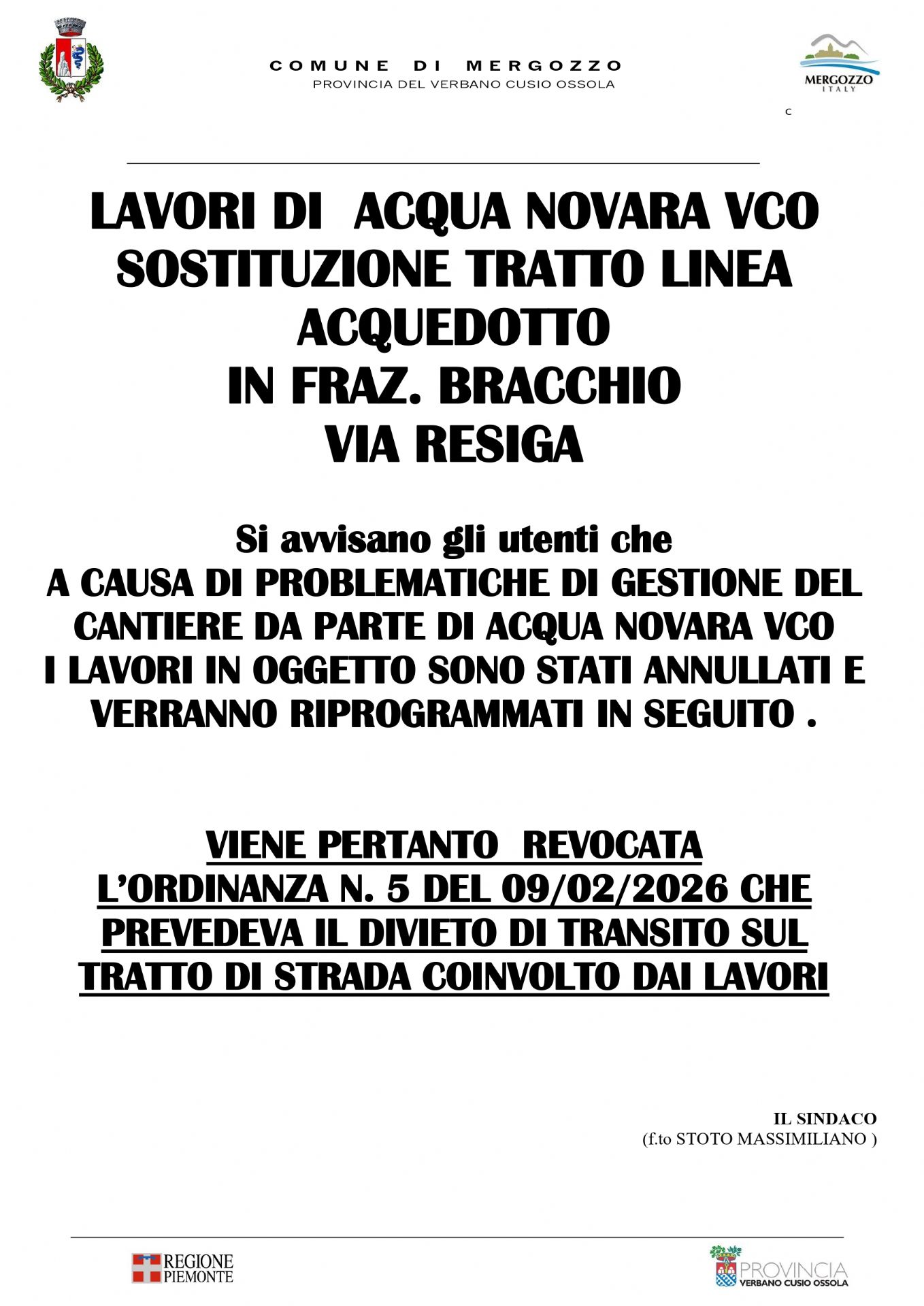 Avviso sospensione previsti lavori di Acqua Novara VCO in Via Resiga fra. Bracchio