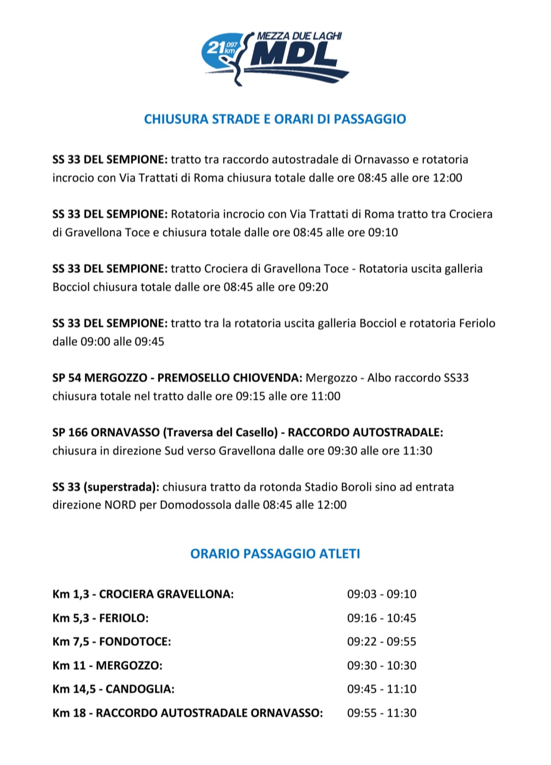 Condividiamo gli orari dei passaggi della Mezza Maratona dei Due Laghi, e le relative chiusure stradali.