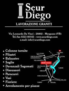Mergozzo la graziosa località affacciata sul piccolo lago omonimo a ridosso dei più ampio lago Maggiore-, è da sempre la terra dove si lavora marmo e granito. La memoria rimanda al marmo delle cave di Mergozzo inviato a Mílano per l'edificazione dei Duomo, e dei graniti per la costruzione di colonne per la chiesa di San Paolo fuori le mura a Roma. E' proprio qui che nel 1962 nasce la nostra azienda artigiana condotta da DANIELE SCUR che inizia la lavorazione dei graniti con la realizzazione di cordoli, ma ben presto affina la produzione con ciotole e fontane. Nel 1989, con l'ingresso del figlio DIEGO, attualmente titolare dell'omonima azienda, e l'acquisto di alcuni macchinari aggiunge la produzione dì colonne in marmo e granito, fino a quattro metri di lunghezza.